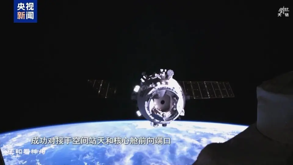 约3.5小时后,神舟二十二号飞船成功对接于空间站天和核心舱前向端口,神舟二十二号飞船转入组合体停靠段。后续,将作为神舟二十一号航天员乘组的返回飞船。